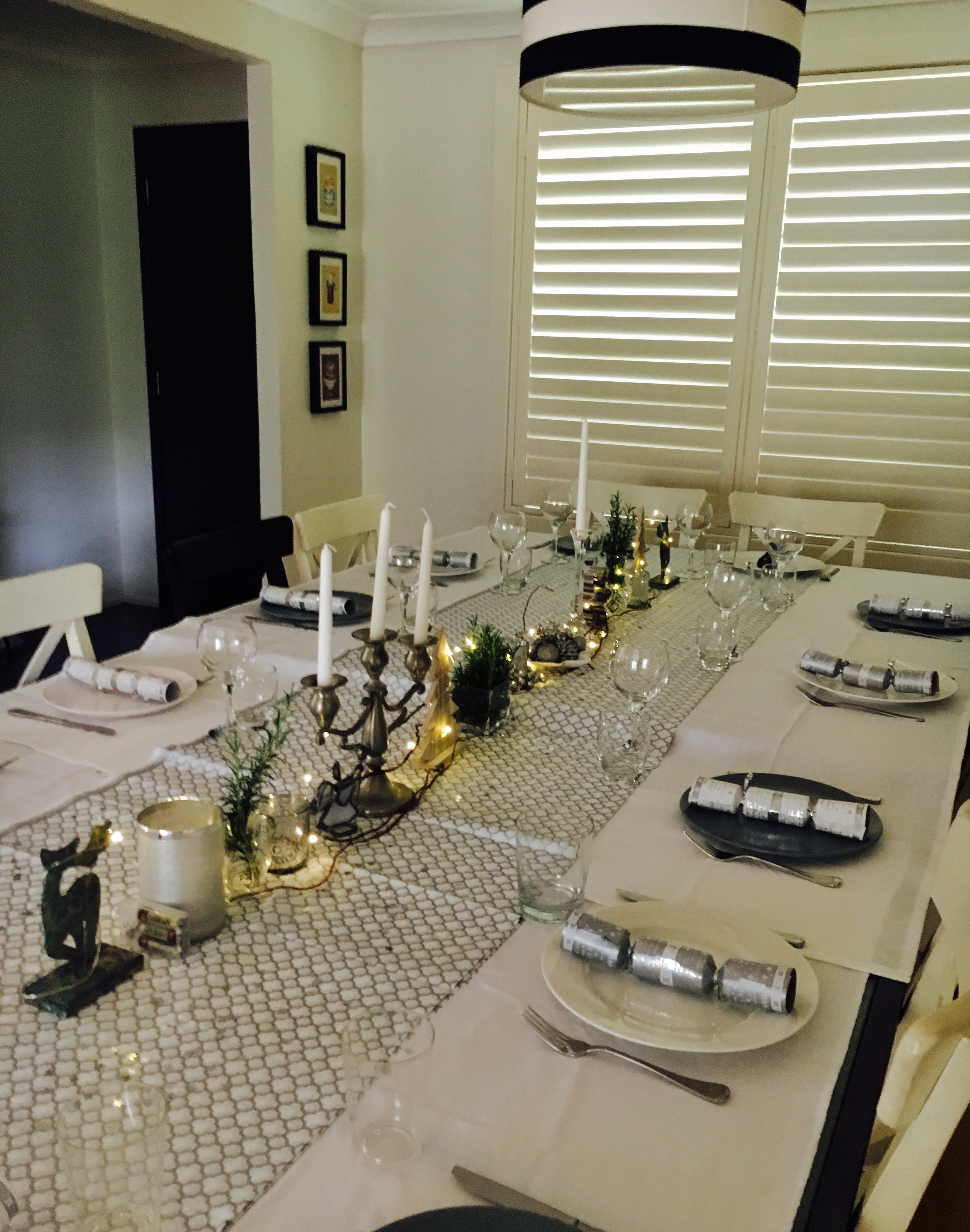 IMG_0829 January 8, 2017 2973 × 3778 Crispy Skin Salmon, Mango Salsa and Coconut Rice With a little furniture re-arranging and chair borrowing, we managed to get 19 into our small dining room! Using fresh rosemary from my herb garden and stuff I had at home already, I only spent $20 on the table setting!