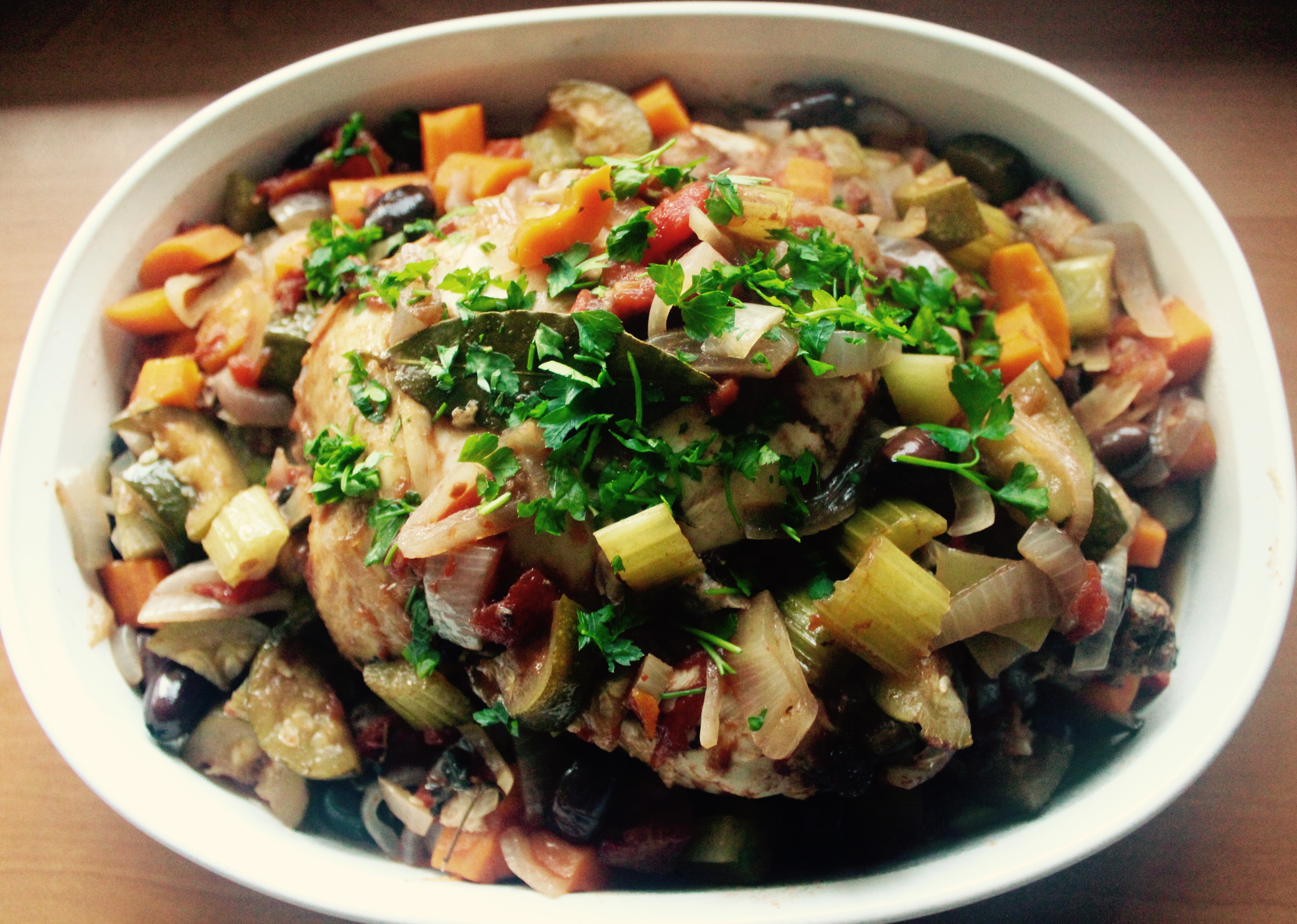 Serve in a big dish, garnished with chopped parsley, straight to the table with some warm crusty bread to soak up all the juices.