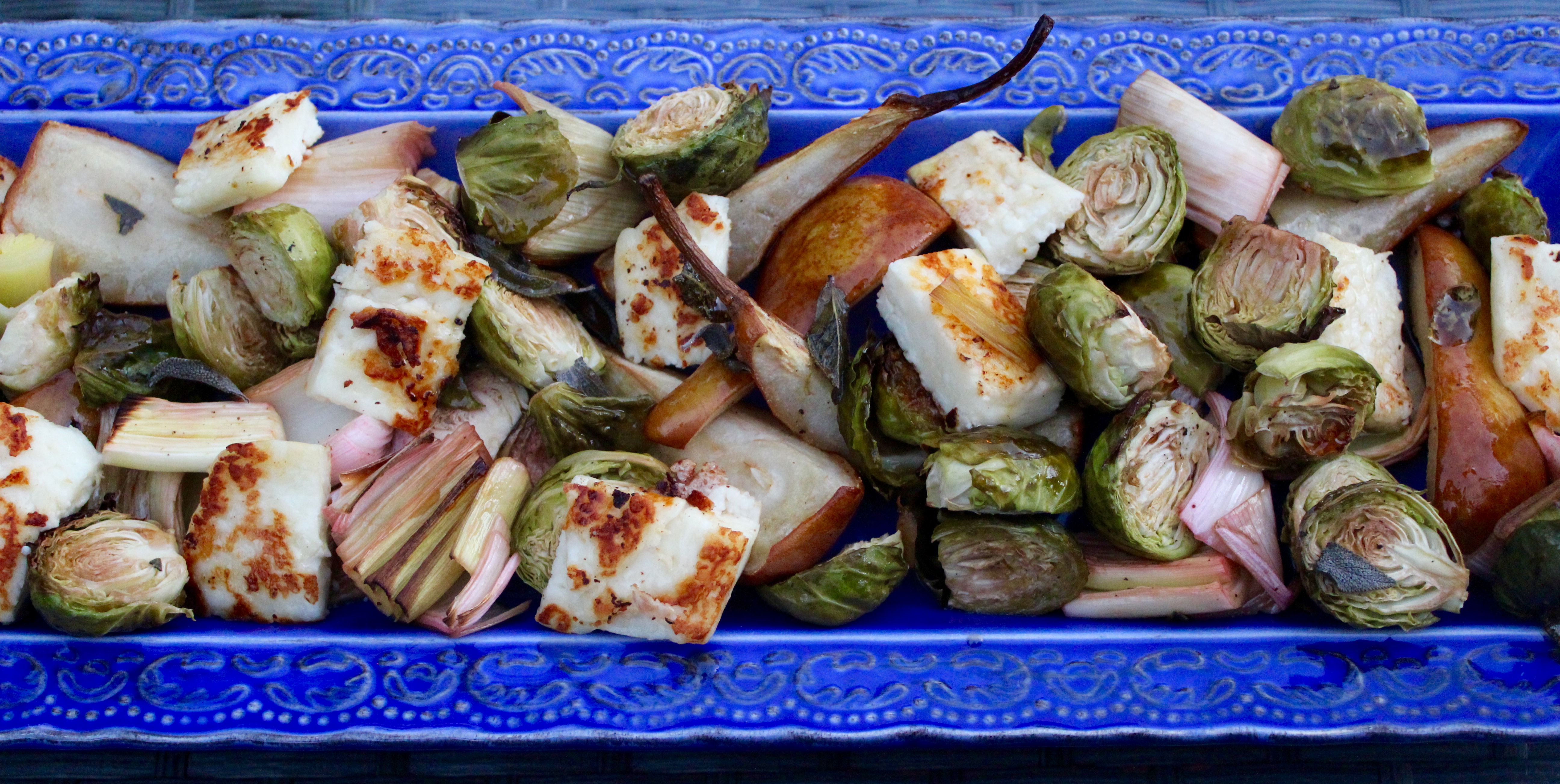 Buerre Bosc pears, leeks, sage leaves and brussel sprouts, drizzled with red wine vinegar and roasted till golden. Add some goats cheese, feta, or in this instance, halloumi, and you have a pretty special salad. You need a salty style cheese to balance the sweetness that comes out of those roasted leeks and pears.