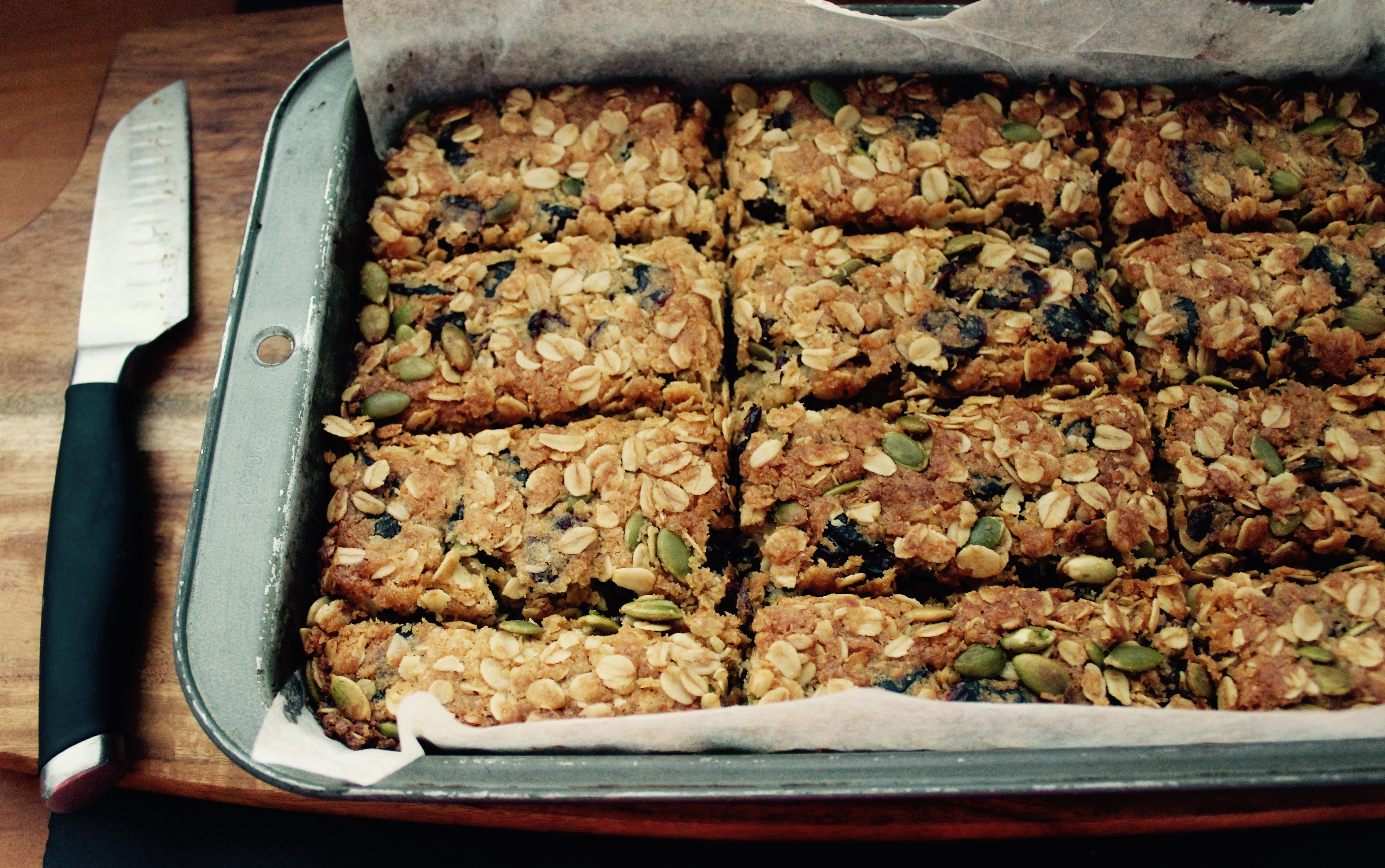 - Line a rectangular slice tin with baking paper.
