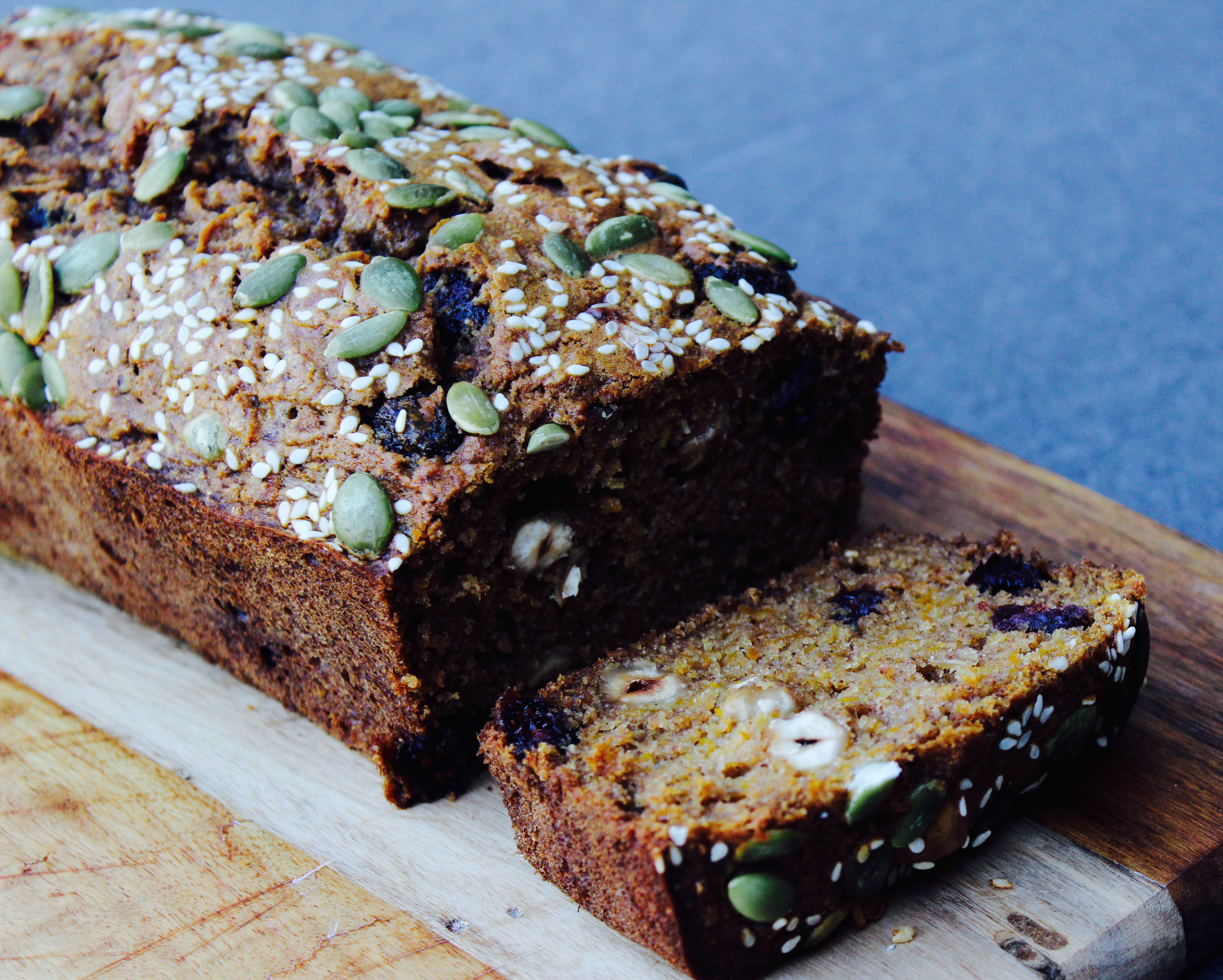 A moist pumpkin loaf, with craisins, nuts and a hint of spice.
