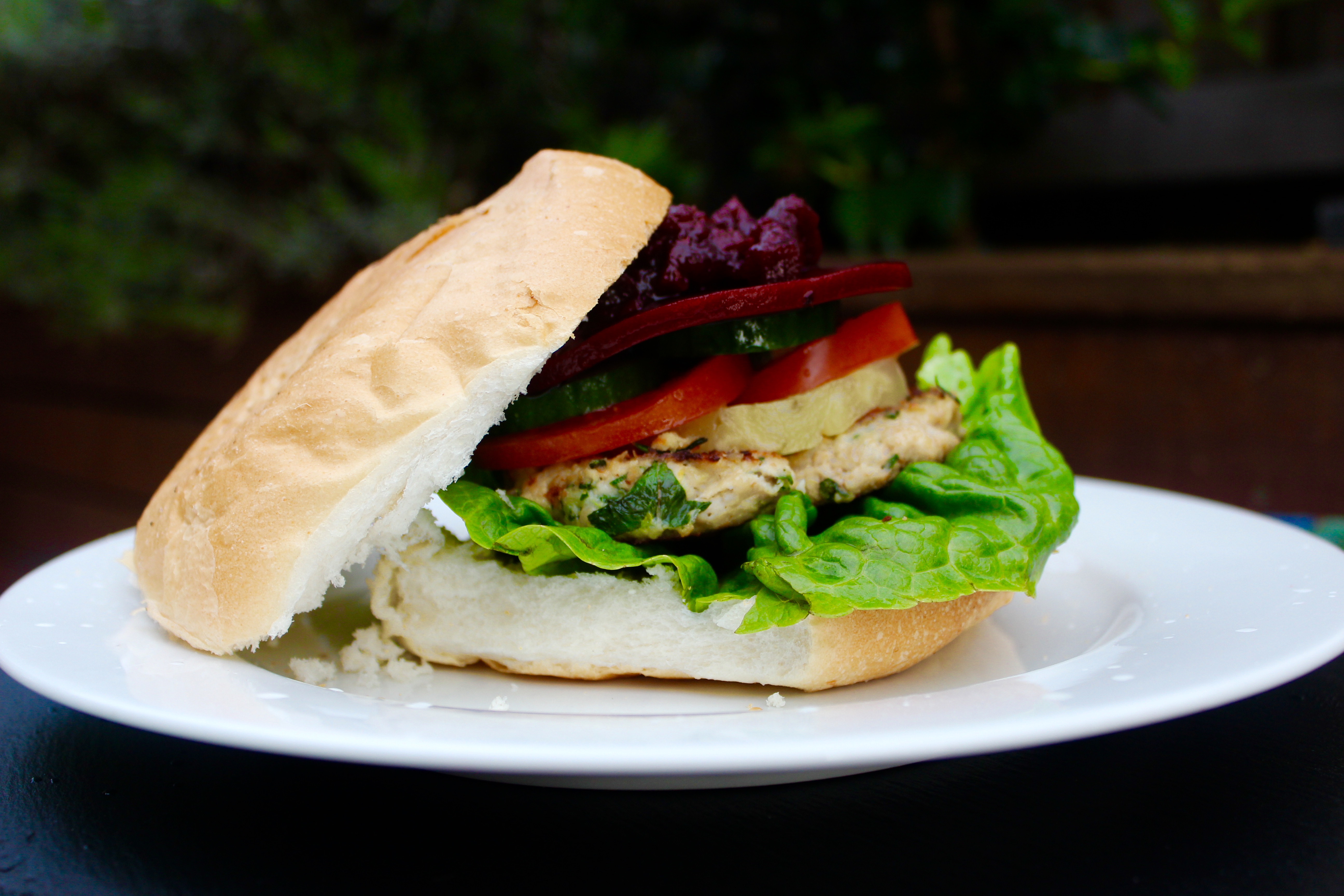 6. Serve on hamburger buns or bread of your choice with any fillings you like! We used lettuce, tomato, beetroot, store-bought beetroot relish, cheese, cucumber and pineapple. Avocado, hummus, Aioli (garlic mayonnaise) all work beautifully as toppings.